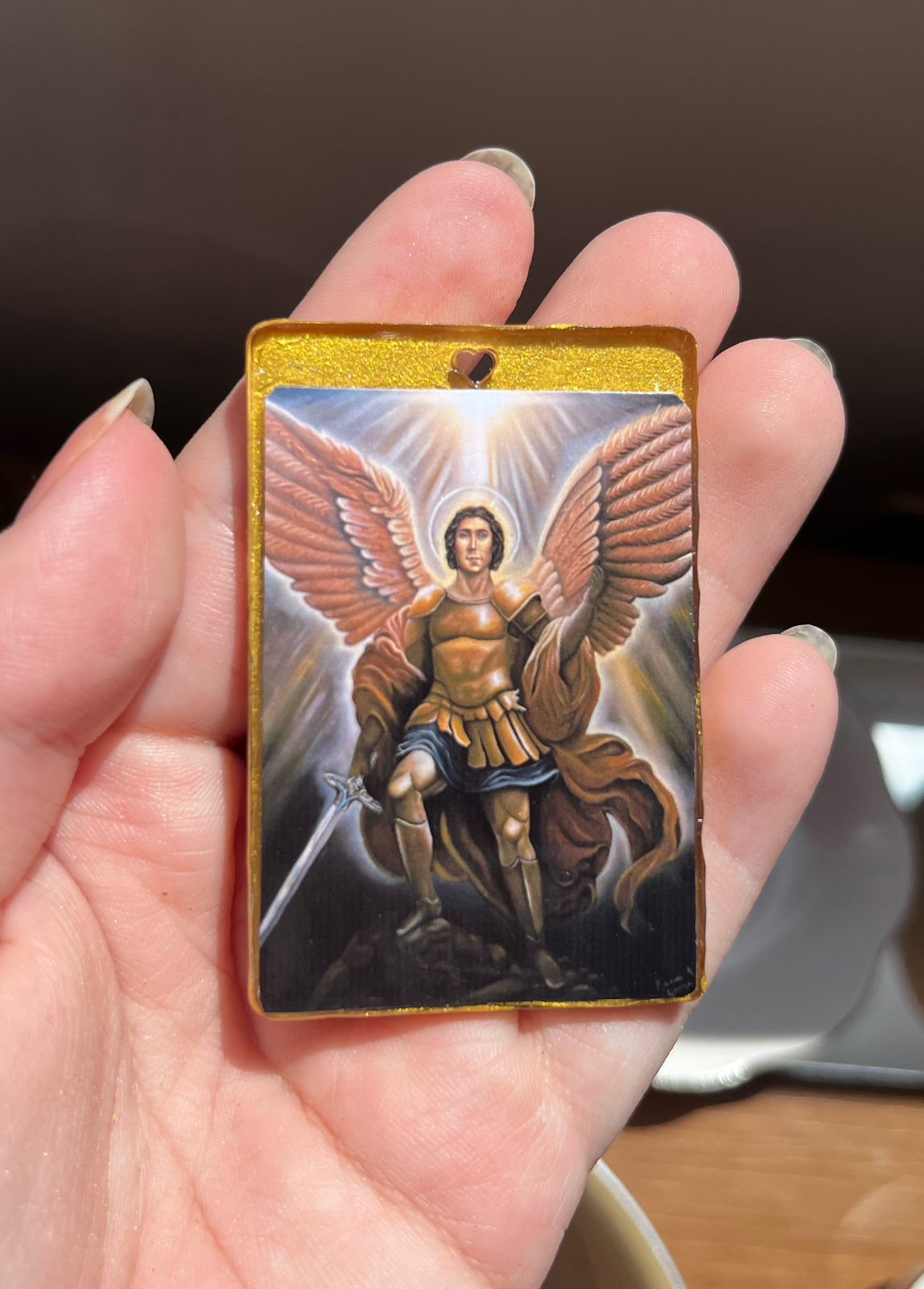 Nesta imagem, São Miguel Arcanjo surge com imponência celestial, envolto em uma atmosfera vibrante que revela o contraste entre o Céu e a terra. A luz, intensa e dourada, rasga as sombras para anunciar a glória divina.